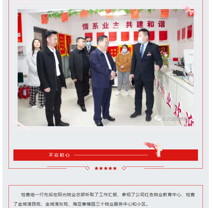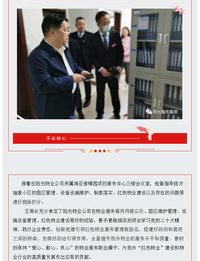 陽光資訊│市住建局黨組成員、副局長、物業(yè)行業(yè)黨委專職副書記王紀(jì)峰同志及行業(yè)專家蒞臨陽光物業(yè)檢查指導(dǎo)